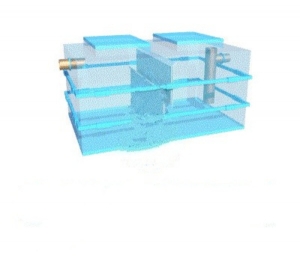 Промышленный (цеховой) жироуловитель большого объема. Устанавливается в технических помещениях крупных молочных, мясных и прочих пищевых производств. Служит для подготовки стоков к сбросу в городскую канализационную сеть. Обеспечивает достижение нормативных уровней ПДК при объеме стока не превышающем 7 литров в секунду. Очистка осуществляется илососом.