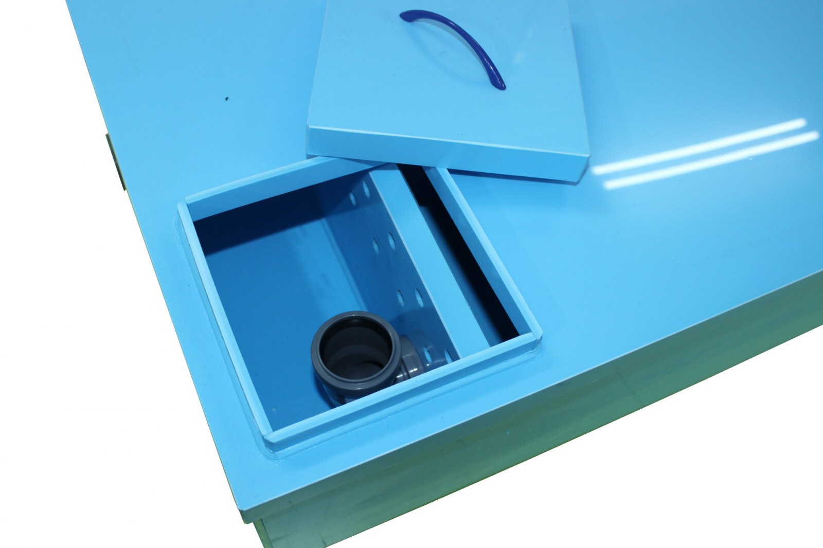 Высота заливной горловины пескоуловителя подобрана с учетом высоты сливного патрубка поломоечных машин с залповым сбросом до 150 литров.